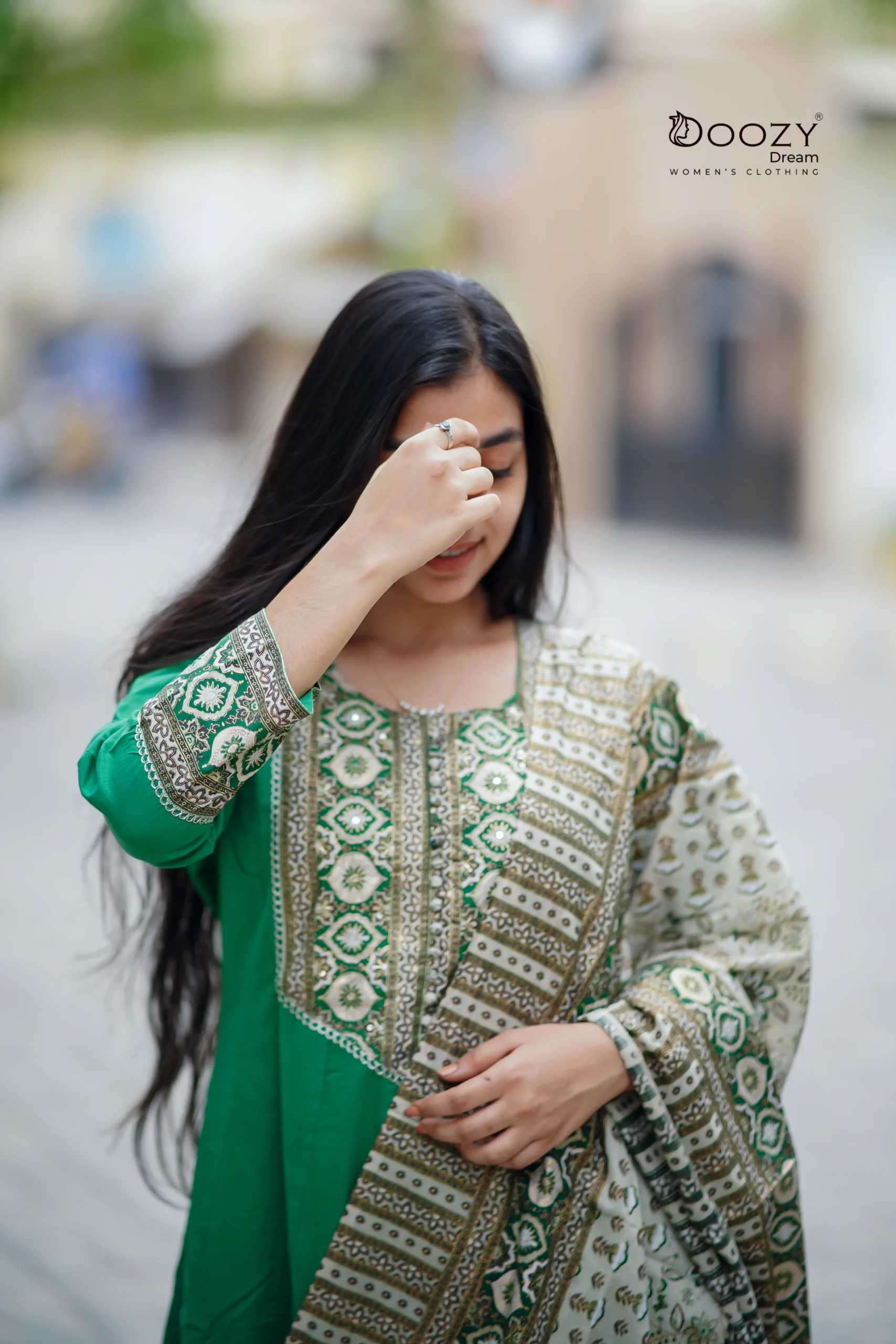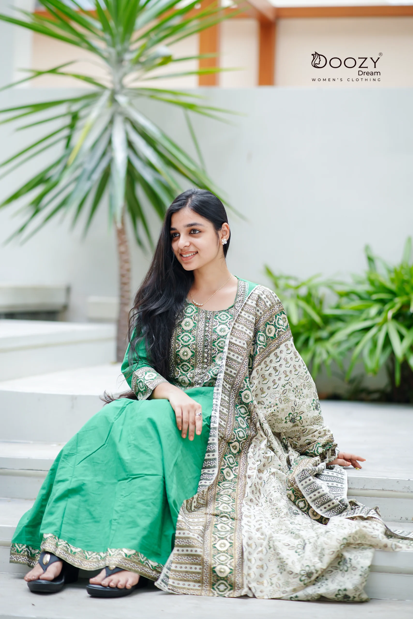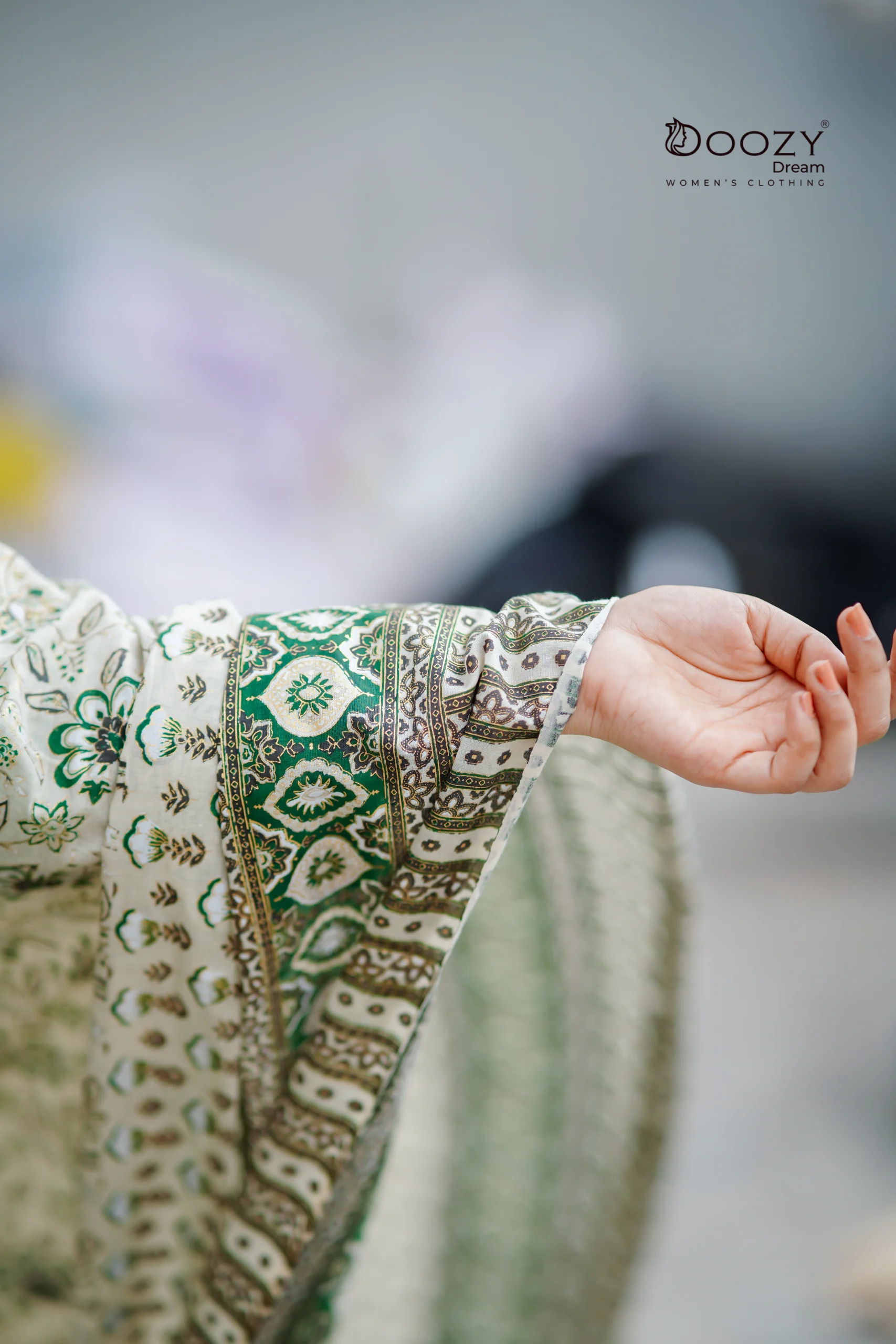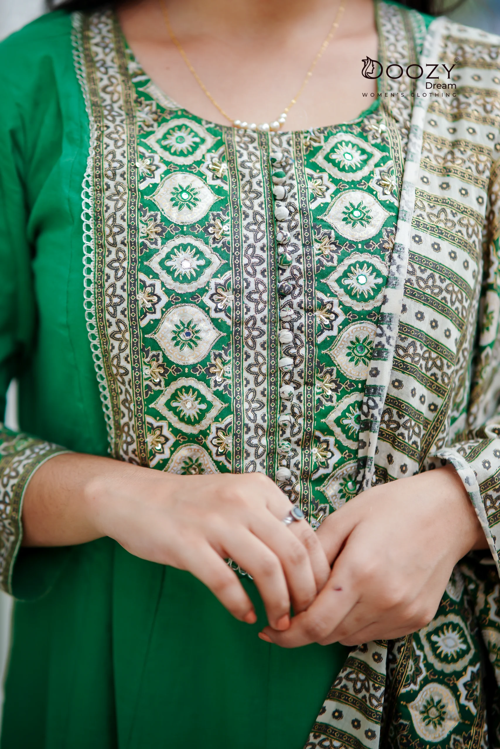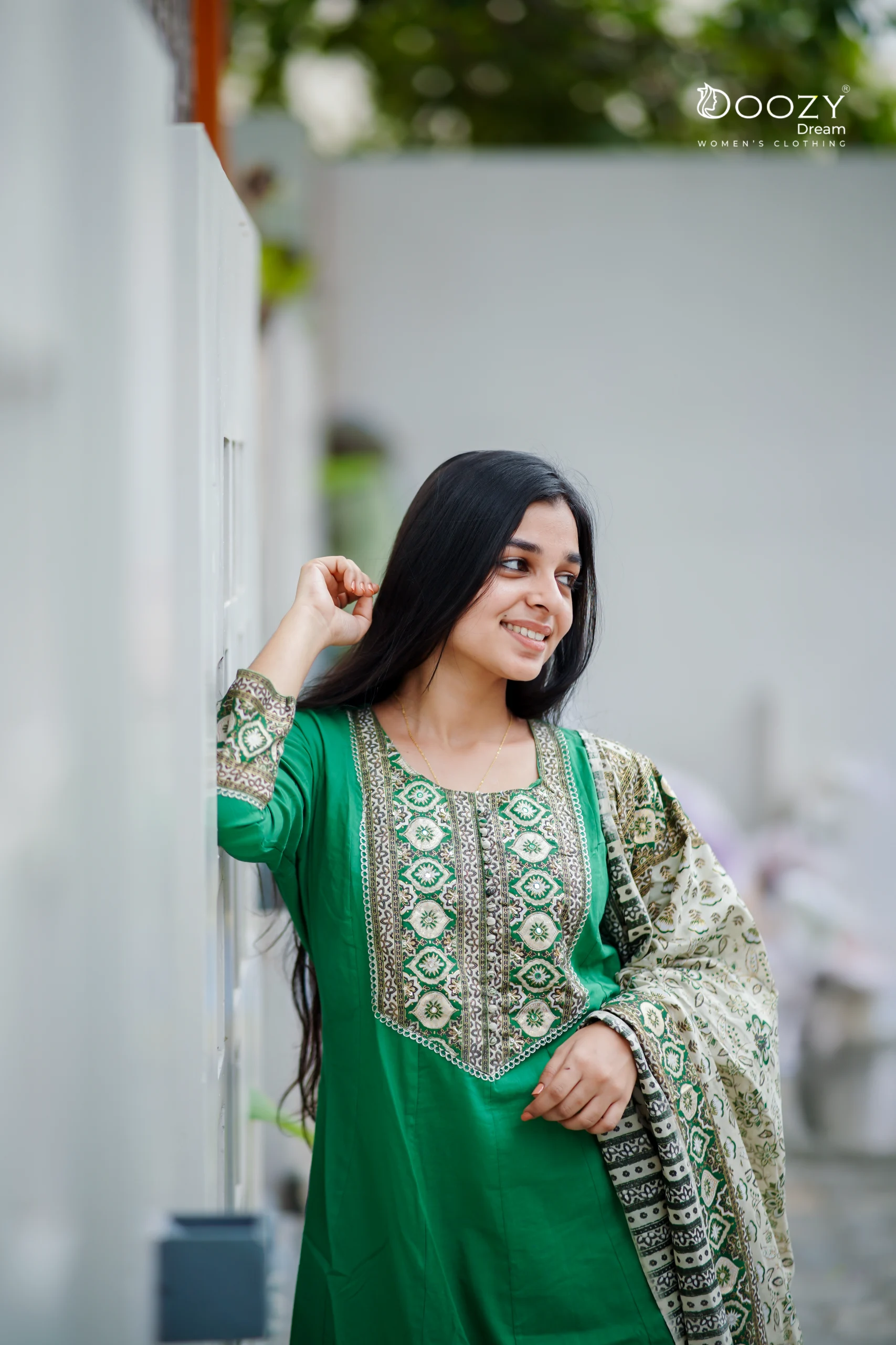 Refreshing emerald green color with contrast printed neckline & cuffs