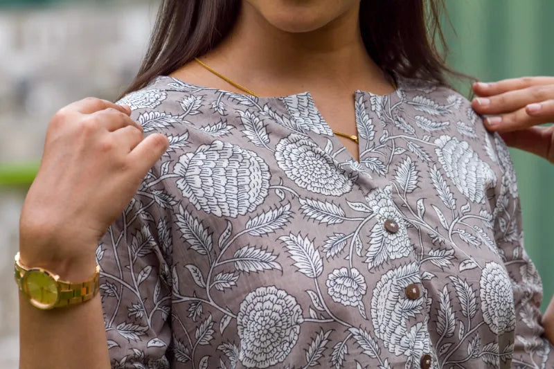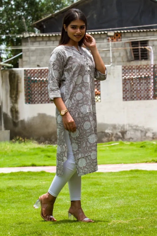 Grace meets subtlety in the Ash Rose Elegance Kurti — a serene blend of earthy greys and delicate floral prints. Inspired by the soft charm of ash-toned petals and timeless design, this kurti is your go-to for understated sophistication.
