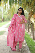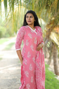 Step into effortless grace with this stunning three-piece pink cotton kurta set, designed to add charm to your everyday style. Featuring a beautiful floral block print in soft white, the kurta boasts a flattering A-line silhouette with a V-neckline delicately accented with lace detailing. The three-quarter sleeves and breathable cotton fabric offer all-day comfort, perfect for both casual outings and festive gatherings.