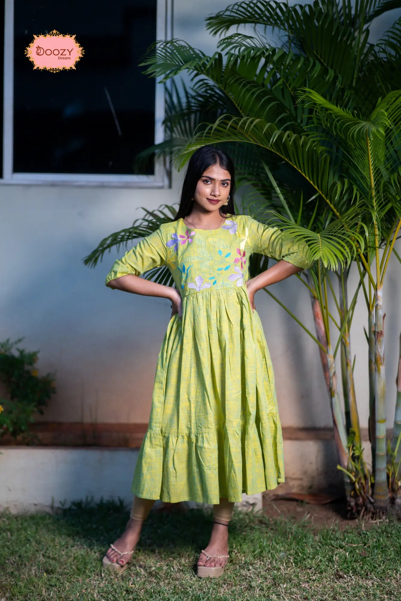 Step into effortless elegance with our Petal Weave Embroidered Cotton Dress. Crafted from soft, breathable cotton, this dress features delicate, hand-embroidered floral motifs that add a touch of artisanal charm to your everyday style. The flattering A-line silhouette, flowing gathered skirt, and three-quarter sleeves create a graceful, feminine look perfect for any occasion — from casual outings to festive gatherings. Its soothing green hue paired with vibrant embroidery brings a fresh, nature-inspired vibe to your wardrobe.