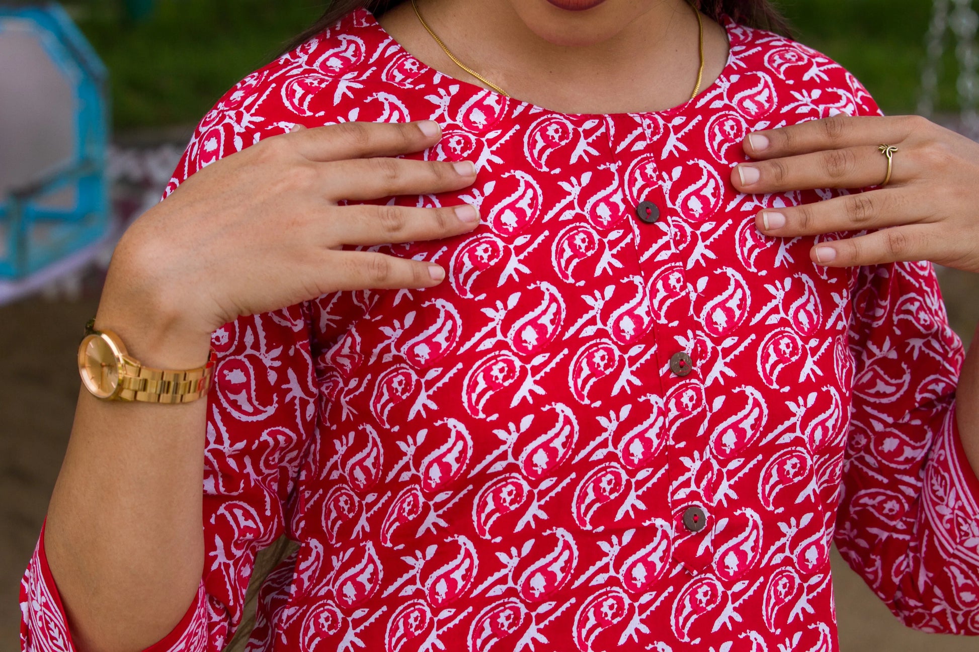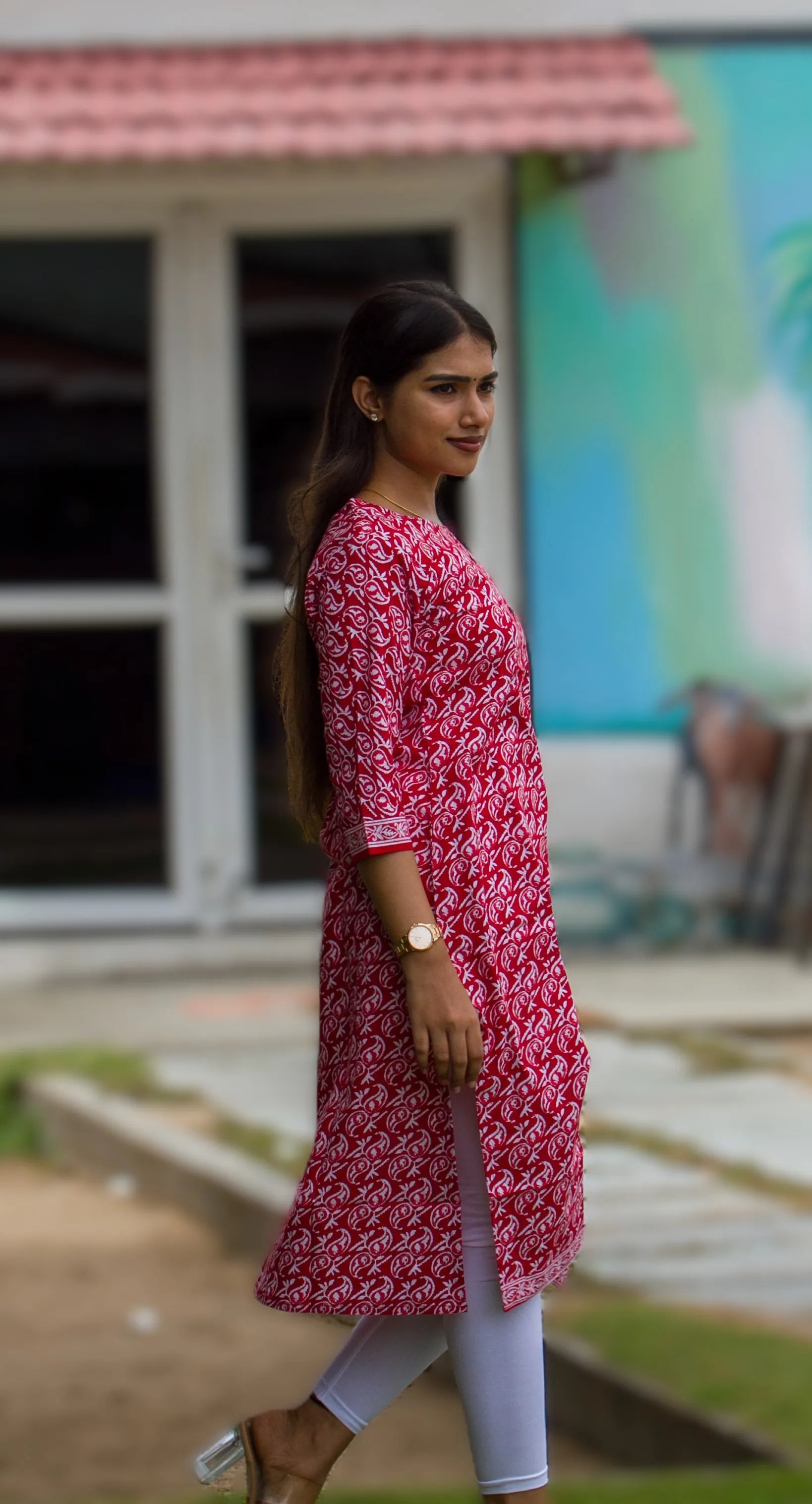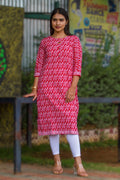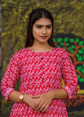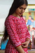 Step into the spotlight with this striking red kurti, where tradition meets modern charm. Adorned with intricate white ethnic prints, this three-quarter sleeve beauty is crafted for comfort and styled for celebration.