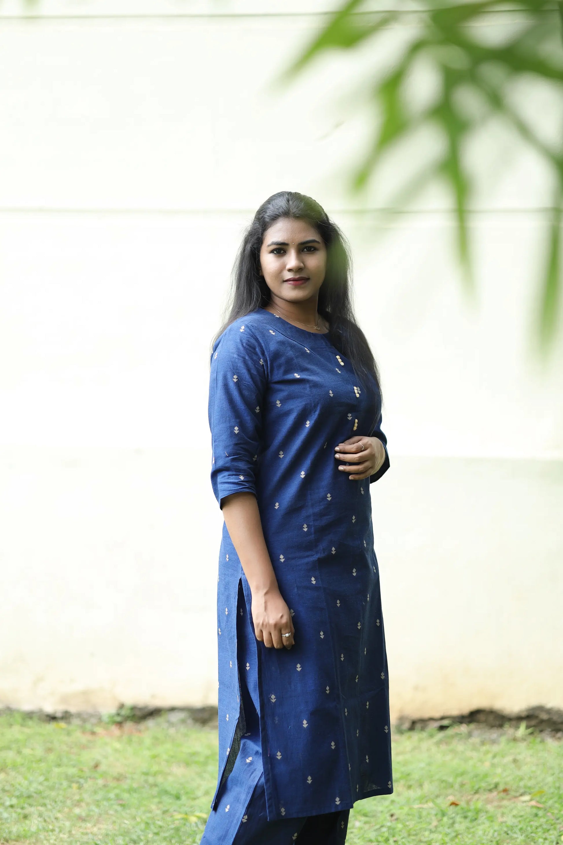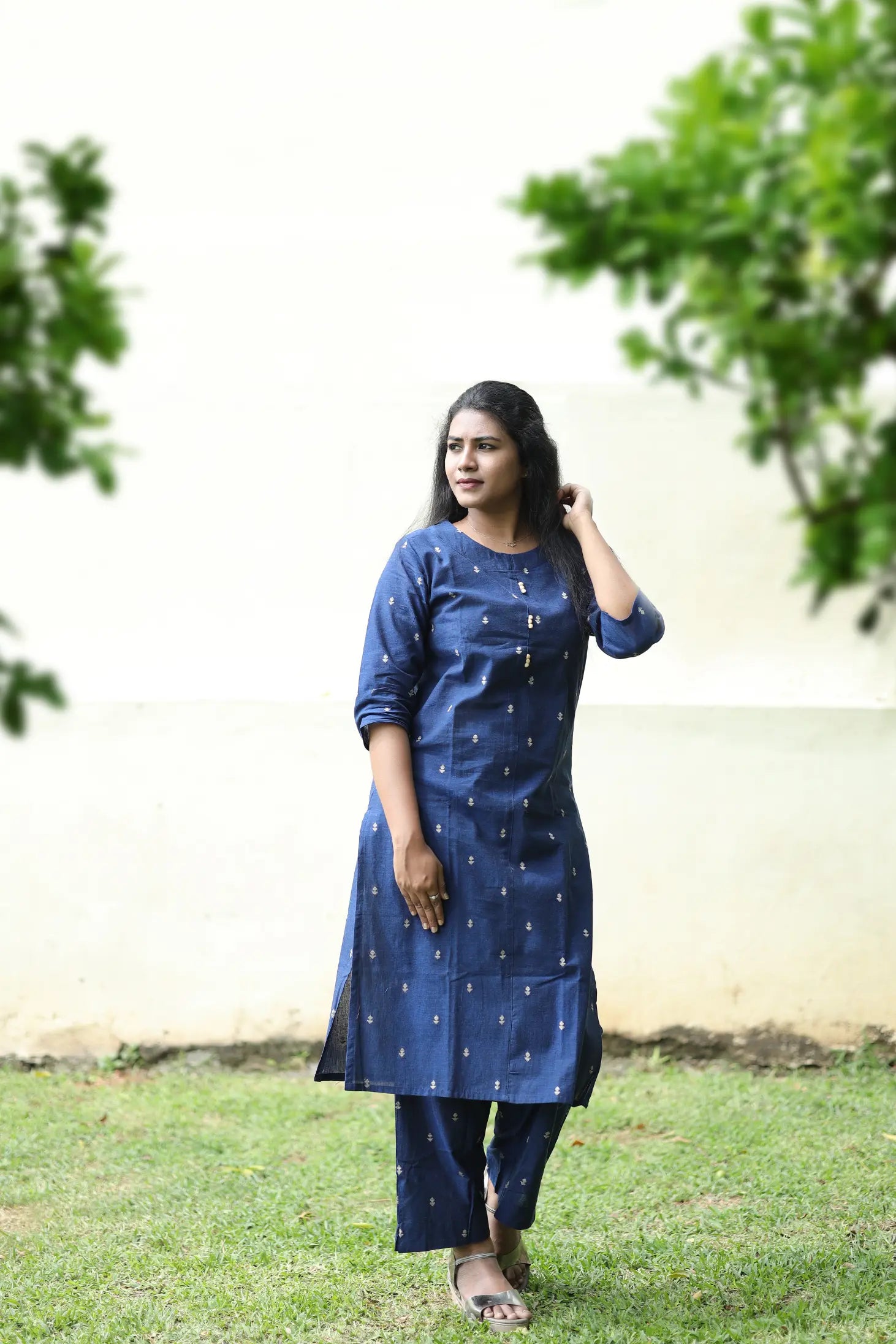 Step into timeless elegance with our Royal hues cotton Ensemble, designed for the modern woman who values comfort with a touch of tradition. Crafted from soft, breathable cotton, this set features a deep indigo hue adorned with subtle golden motifs that exude understated charm. The straight-cut kurta, paired with matching tapered pants, offers a clean silhouette perfect for both everyday wear and casual outings.