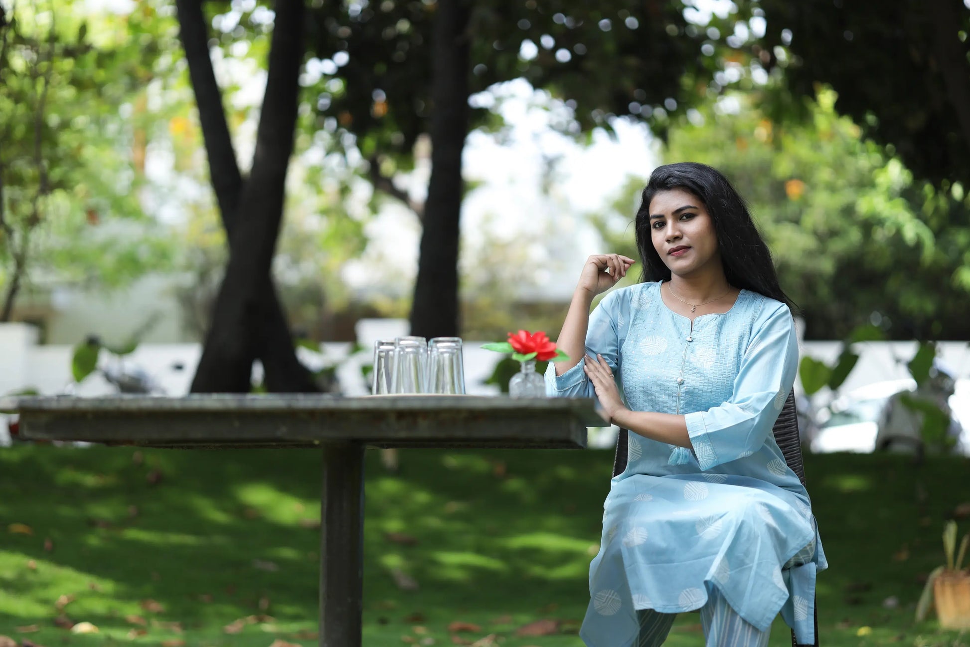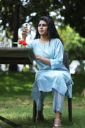 Step into effortless elegance with our Sky bloom Kurta Set. Crafted from soft and breathable cotton, this pastel blue kurta features subtle white circular motifs and a charming embroidered yoke with delicate tassel detailing. The straight-cut silhouette, paired with striped matching pants, offers a graceful yet comfortable fit — perfect for casual outings, office wear, or relaxed weekends. Its 3/4th sleeves and side pockets add to the functionality without compromising style.
