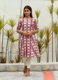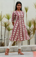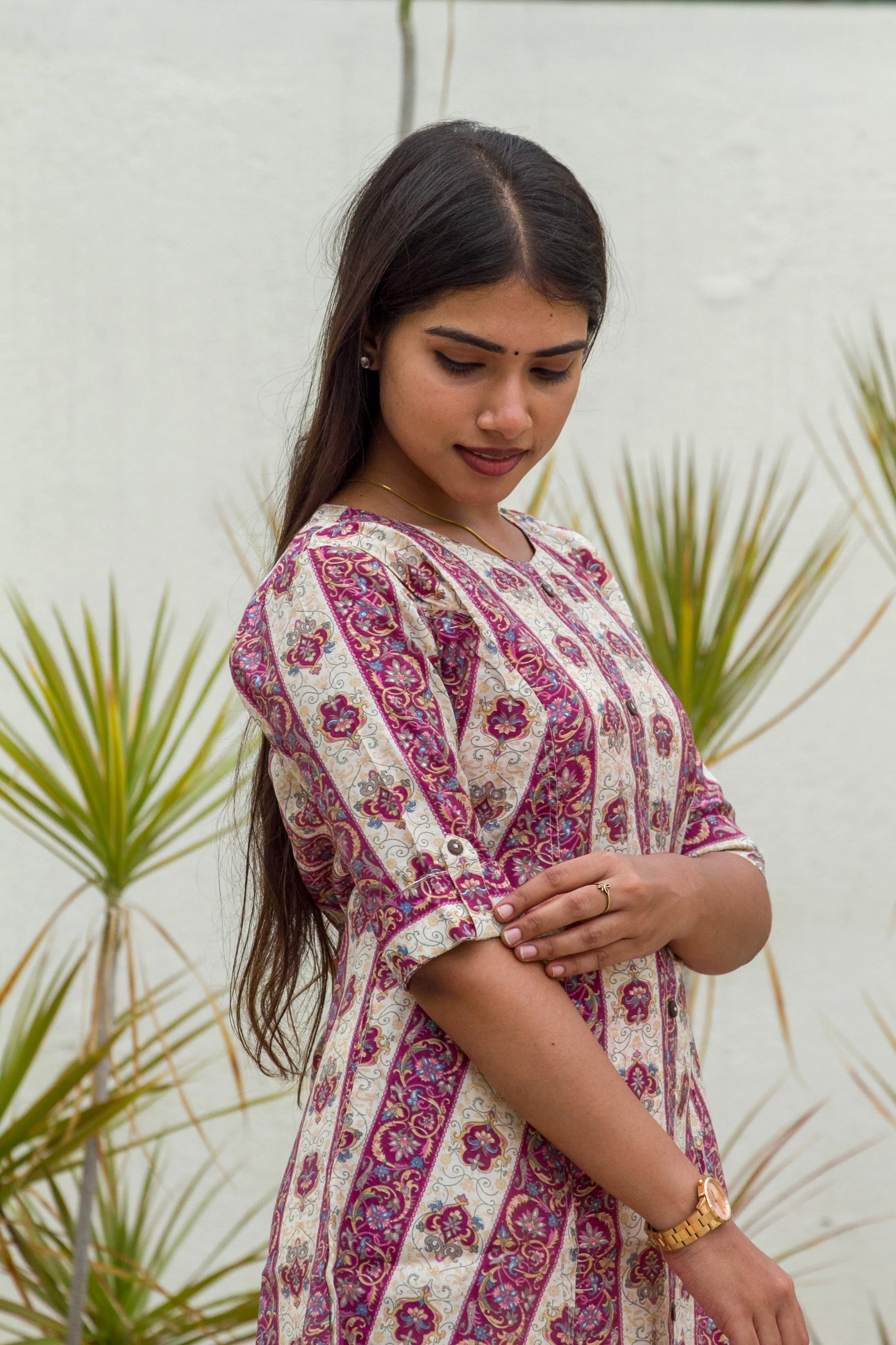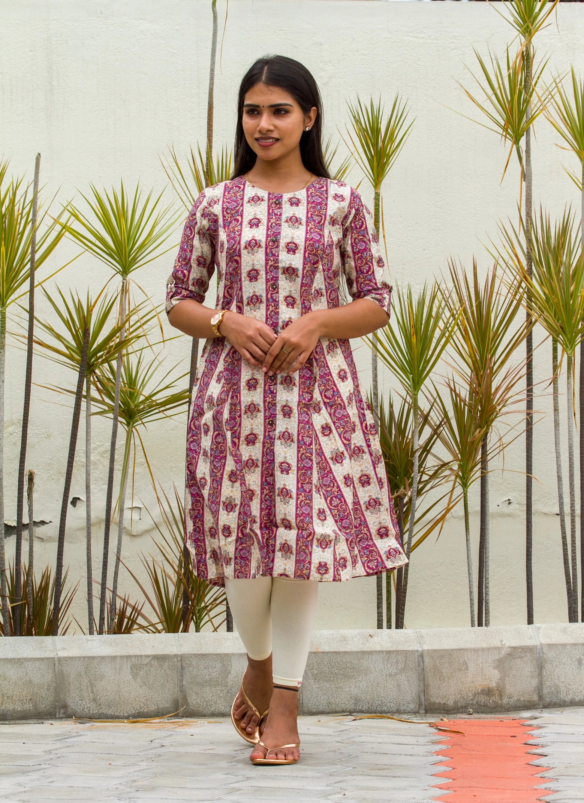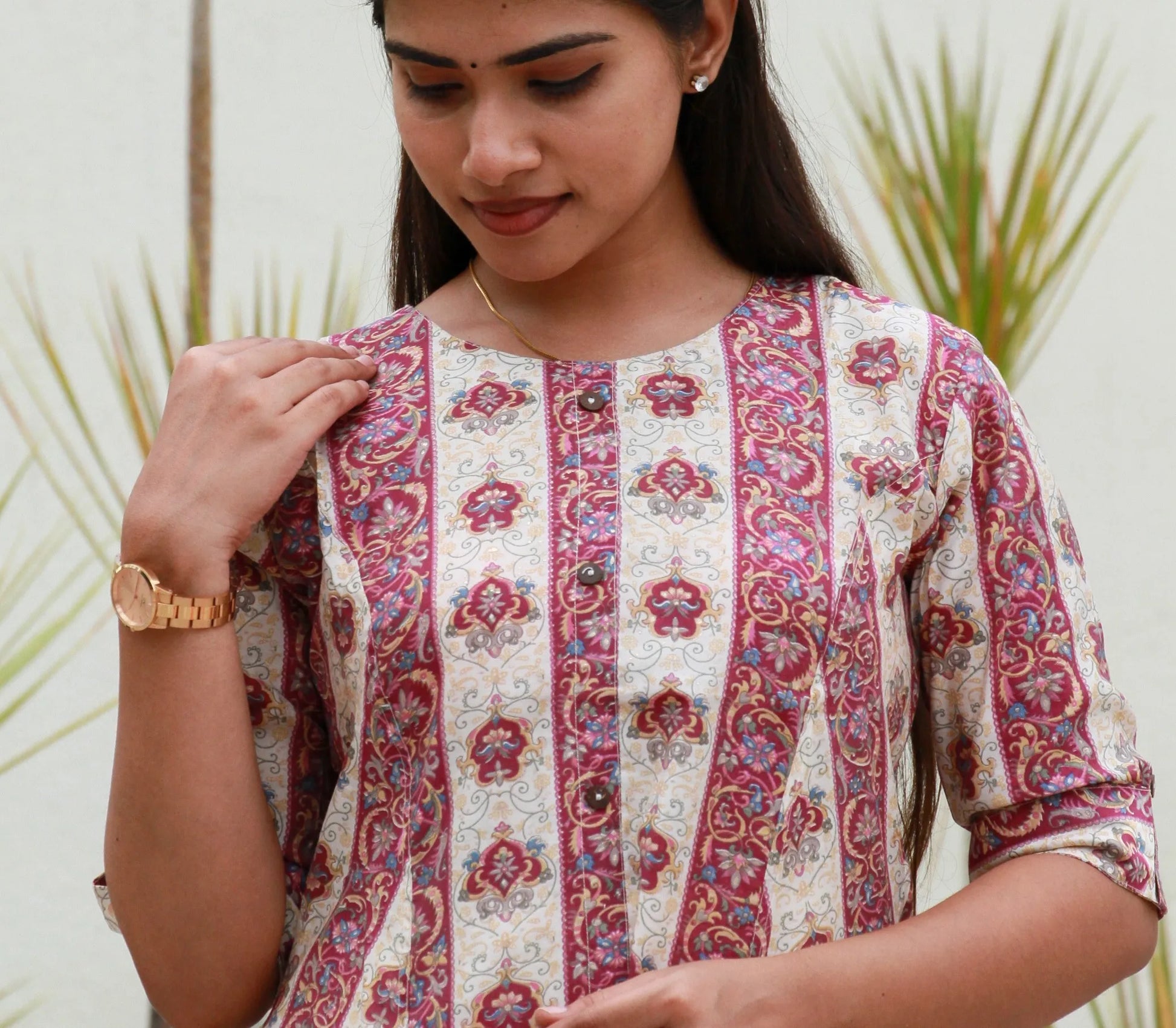 Featuring rich maroon floral stripes on a soft beige base, this kurti brings together tradition and trend in the most graceful way.