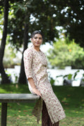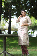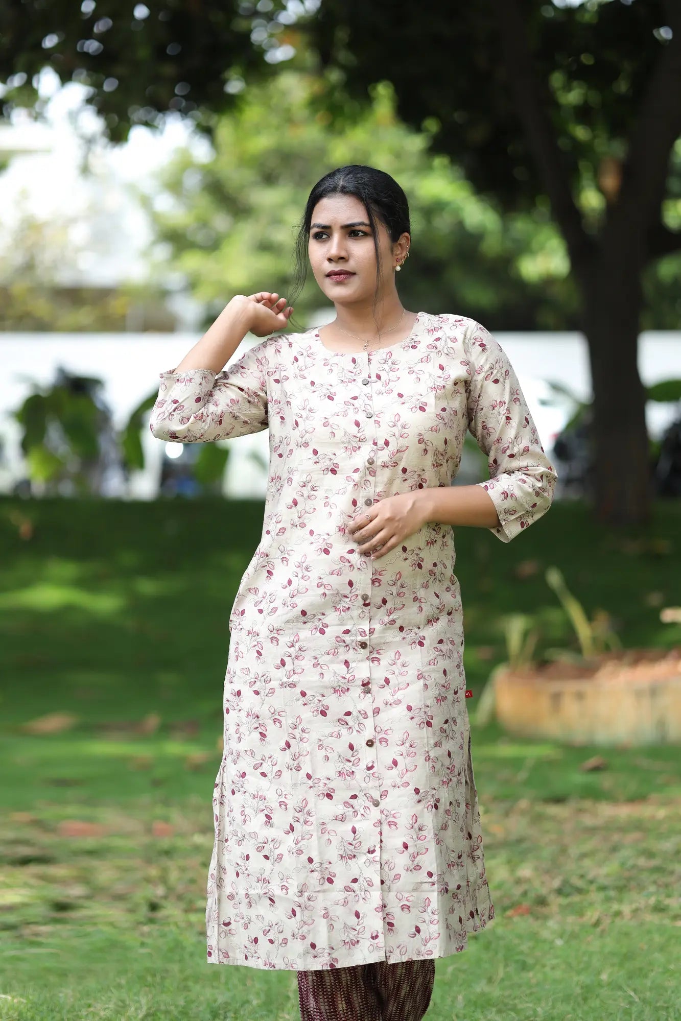 Elevate your everyday style with the vintage vines Kurta Set, a perfect fusion of subtle charm and all-day comfort. Made from soft and breathable cotton, this cream-colored kurta is adorned with delicate maroon and rose-toned leaf prints, bringing a fresh and natural vibe to your wardrobe. The front button-down detailing and 3/4th sleeves add a touch of sophistication, while the straight cut ensures a flattering silhouette. Paired with matching printed bottoms, this set is a go-to for effortless elegance.